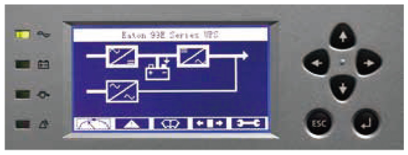 為便于IT管理員及機(jī)房動(dòng)力系統(tǒng)管理者能更加方便對(duì)UPS進(jìn)行操作管理,伊頓93E設(shè)計(jì)標(biāo)配了大屏幕圖形化LCD顯示器,為UPS管理者提供有關(guān)UPS的工作狀態(tài)和工作參數(shù)的模擬圖形顯示和數(shù)據(jù)顯示。同時(shí)也提供了UPS必要工作參數(shù)設(shè)置的簡(jiǎn)易管理界面。
