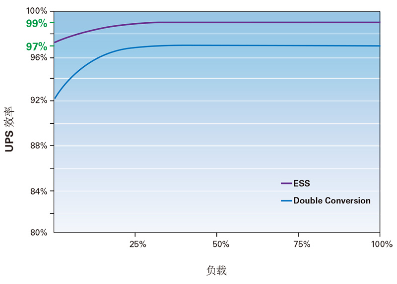 當(dāng)93E的工作在ESS高效工作模式下,UPS的系統(tǒng)效率將會(huì)高達(dá)99%。