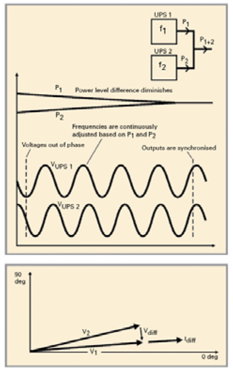 伊頓UPS采用了伊頓的數(shù)字信號(hào)處理(DSP)算法專(zhuān)利技術(shù),使并機(jī)的UPS的輸出趨于同步和負(fù)載平衡。基于UPS內(nèi)部處理器每秒鐘多達(dá)3000次以上的數(shù)據(jù)采樣分析,熱同步并機(jī)系統(tǒng)發(fā)出指令讓各個(gè)UPS根據(jù)所帶的負(fù)載量對(duì)各自逆變器頻率分別作非常微小的調(diào)整,用以找到一個(gè)共同頻率和負(fù)載平衡點(diǎn),并把UPS之間的相位差降至接近于0,以達(dá)到精確的負(fù)載均分。 UPS通過(guò)積分測(cè)量相位值的方法實(shí)現(xiàn)可控的輸出頻率,通過(guò)頻率鎖定和與外部旁路參考頻率的同步,實(shí)現(xiàn)參與并機(jī)的各臺(tái)UPS系統(tǒng)之間達(dá)到穩(wěn)定的輸出相位和頻率,達(dá)到系統(tǒng)輸出的動(dòng)態(tài)平衡。